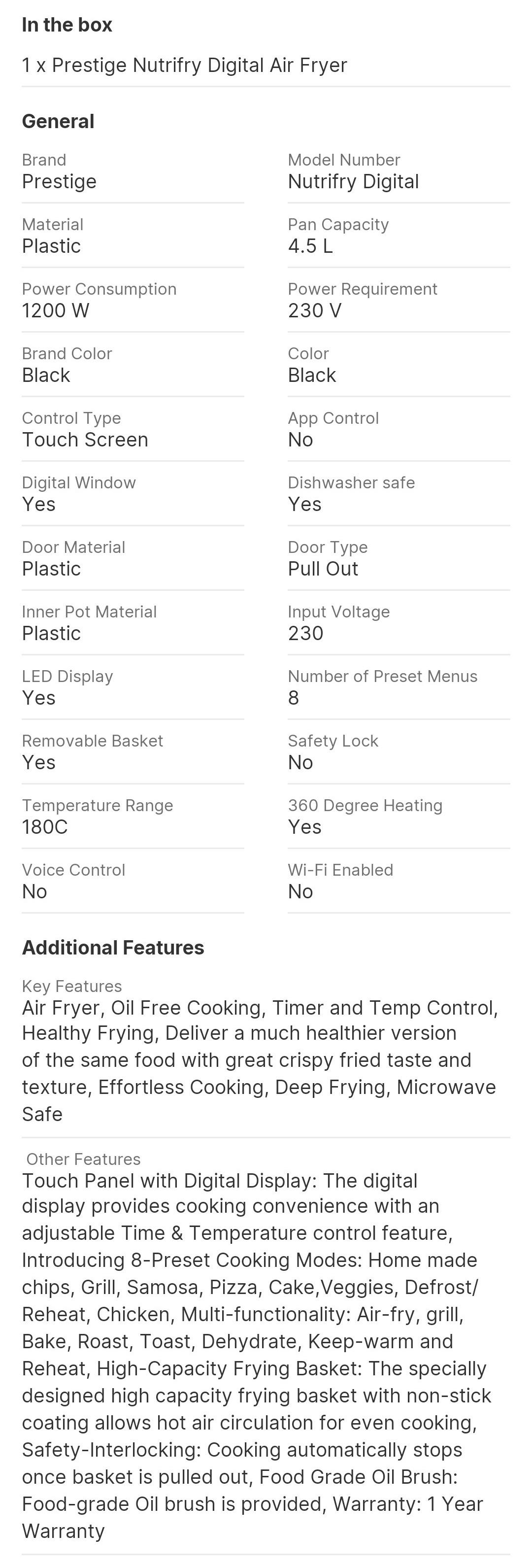 Prestige Nutrifry Digital Air Fryer (4.5 L)