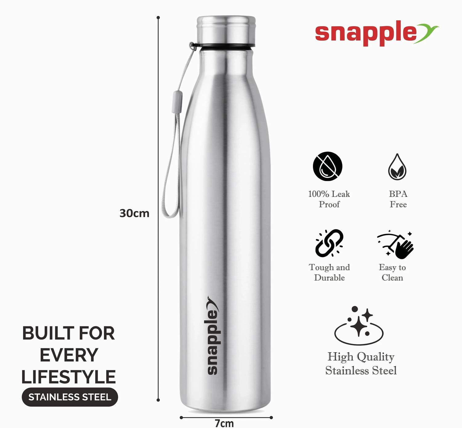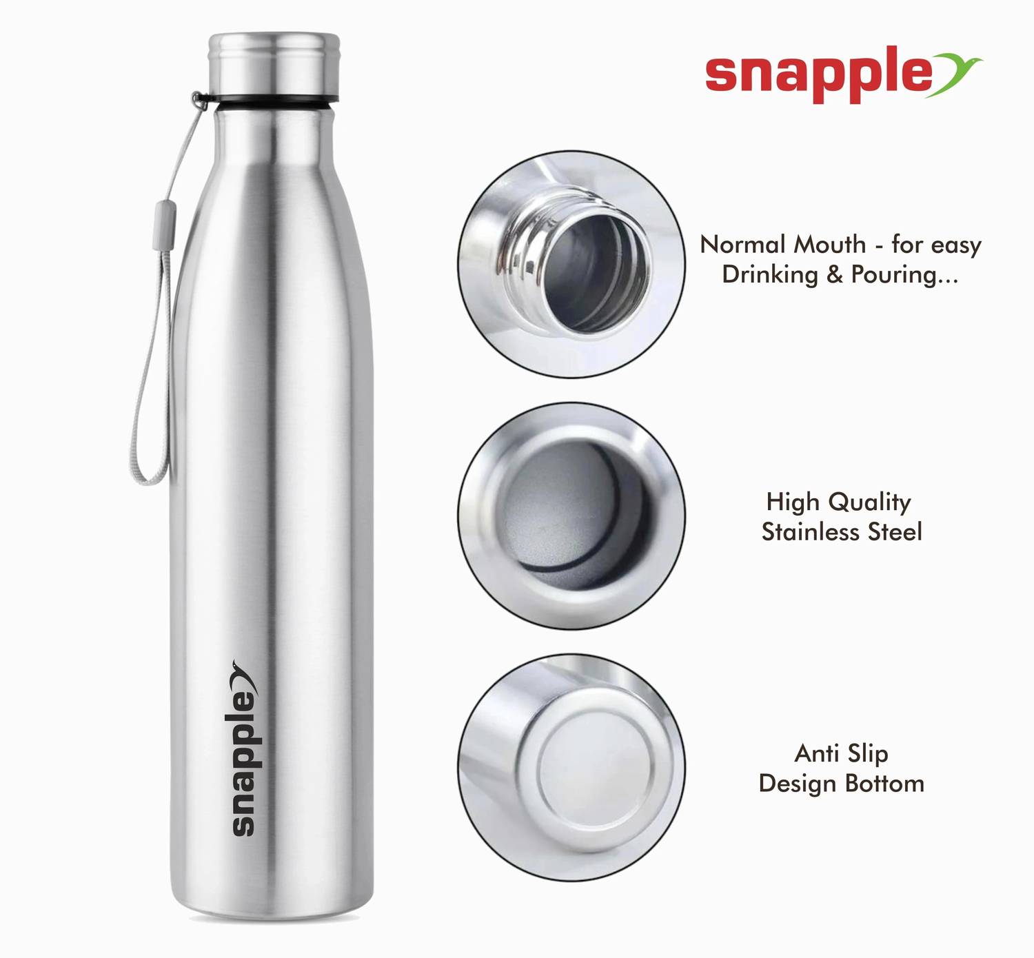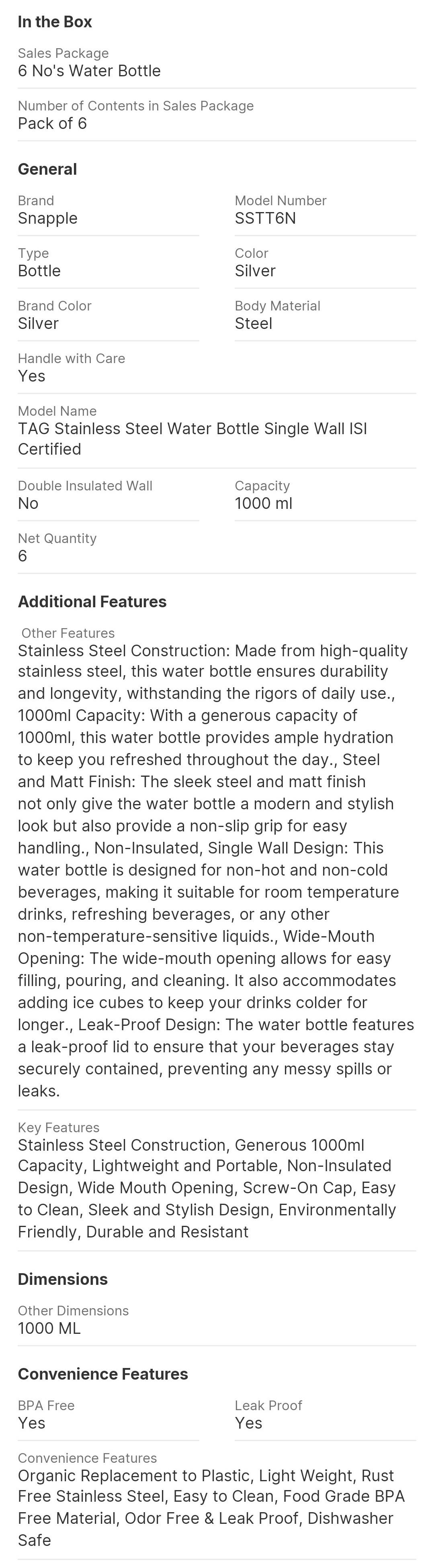 Snapple TAG Stainless Steel Water Bottle Single Wall ISI Certified 1000 ml Steel Bottle (Pack of 6, Silver)