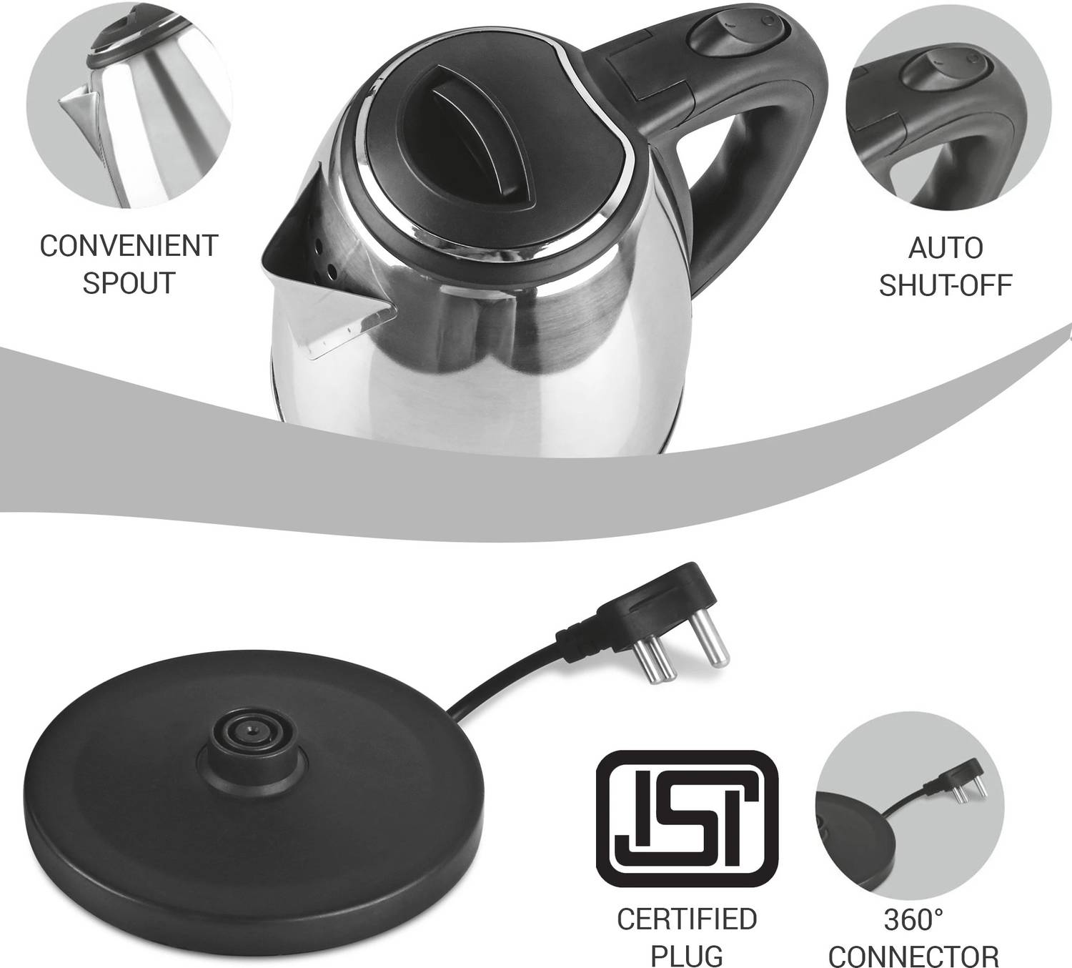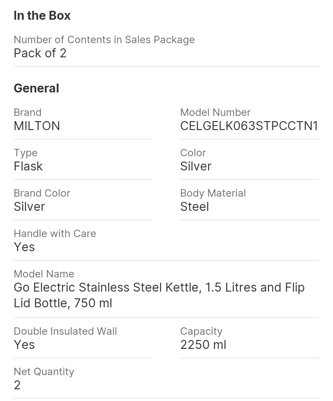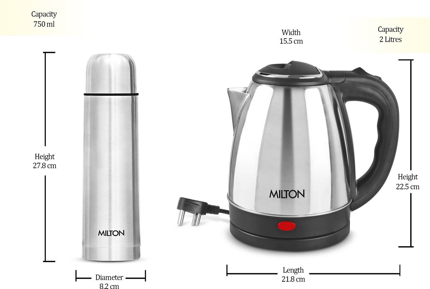 MILTON Go Electric Stainless Steel Kettle, 2 Litres and Flip Lid Bottle, 750 ml 2750 ml Steel Flask (Pack of 2, Silver)